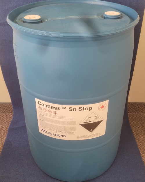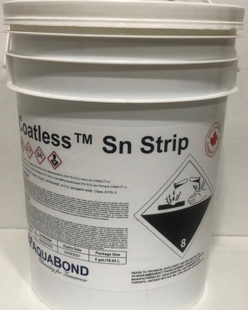 Coatless™ Sn Strip was formulated to strip printed wiring boards with minimal attack on the copper in a single step at room temperature. It is a single step, ready-to-use solution with fast stripping time. It is packaged in 18,93 L pails and 208 L drums. See below in document section for TDS and SDS information.